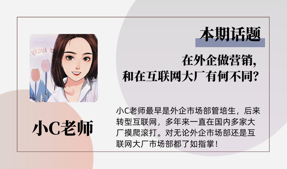 外企 市场部通常小而美,分工明确,人员精简,工作体系化规范化(俗称SOP),更清晰,更有迹可循。想要做marketer的伙伴们毕业后第一站去外企市场,可以打好地基,是建立基本盘的好选择。 字节跳动 整体氛围非常结果导向,如何迅速如何行动,张一鸣的面对面会议务实接地气很“字节范”(ByteStyle),但现在作为拥有超过10万员工的宇宙大厂,业务团队间的氛围差异相对较大。不过,办公区环境十分友好,行政IT等基础支持相对99%的公司而言听说相当到位(据说7*24小时轮班,一般5分钟给到回复,神了!),你只需聚焦思考业务。而做marketing,在字节可以有活动/策划/运营/品牌/明星营销多种方向可选,想要感受不同职能的趣味,倒是可以一站体验。当然要注意的是,工作压力也是宇宙级别的! 美团 虽然总被诟病是“开水团”,除了开水别无福利。实际上,相对来说可以排上人均待机时长最久的互联网公司(稳定性高)。本地生活Top 1的宝座阿里总是想来撼动,但始终未遂。护城河强劲的结果就是,相对稳健和不那么拥抱变化的氛围。哦,对了,听说基本福利都还是有的,商业医疗保险甚至报销全额(这个点字节都未能比肩)。 阿里巴巴 阿里味儿是一种不可描述的气质,全在乎HRG的感受。若不能一见钟情,则便是相忘于江湖。小C老师曾浅待过的阿里本地生活,深觉不适。她表示此处暂且不发表评论。 咨询小C老师 用户反馈 Customer Feedback 通过一个小时的咨询,对工作有了更深刻的理解,感谢平台连接的行业前辈! 这次咨询给到了我很多意想之外的新思路,很少有这样可以聚拢行业专家资源的小众平台。 感觉真的不错,后面我整理下思路,还会定期约这种咨询服务的!