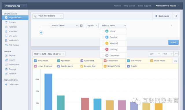 3. 一个更牛的Compass(用户指南针)的功能。简单讲,这是一个具有人工智能的分析模块,它的目的是根据所有用户的行为,判断出那些能够让用户“路转粉”的关键行为,这类行为一旦被找到,就意味着你可能找到了通往生意成功的金钥匙。例如,它可以判断某个app的用户,一旦使用了“照片下载”会有多大的概率成为“忠诚用户”,如果很大,那么“照片下载”就会是一个关键行为。这个功能让我觉得相当有创意。但实际上,关键行为更可能是“在7天内把照片分享给了10个朋友”之类的行为,对这类行为,这个工具同样能够利用机器大脑计算出来。