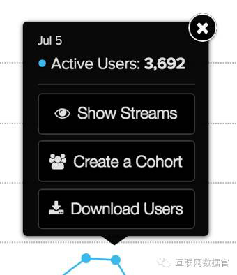 黑色的放大的图中的“show streams”、“create a cohort”就是这个数据的两个细分属性,“download users”则是具体功能(数据导出)。