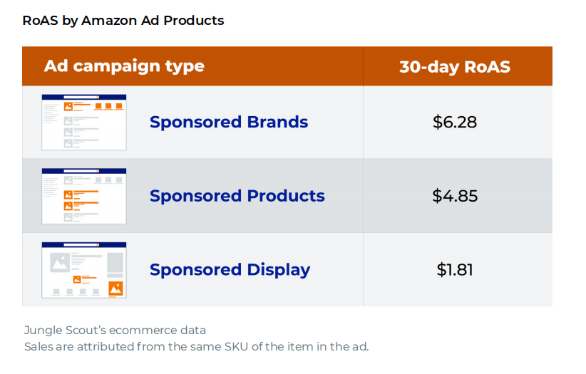 赞助品牌广告的投资额持续增长,同时回报也在增长。在Jungle Scout电商数据库记录的广告活动类型中,赞助品牌广告在30天内获得的RoAS表现最佳。