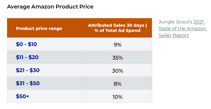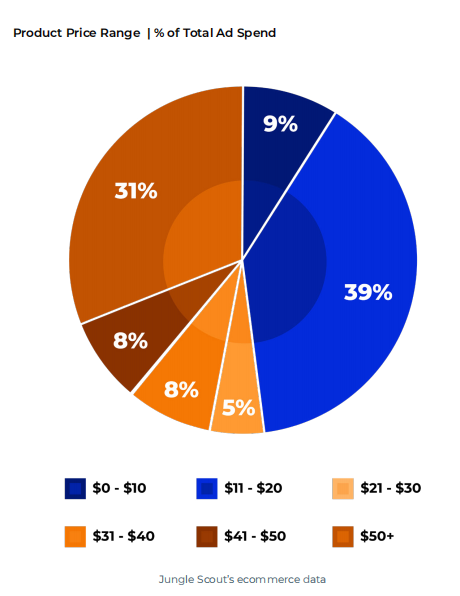 在评估了亚马逊上的近10000种广告产品后,最高的广告花费出现在11-20美元的产品价格区间。 然而,也有大量购买10美元以下的情况出现,较低的产品价格范围内存在着大量竞争。