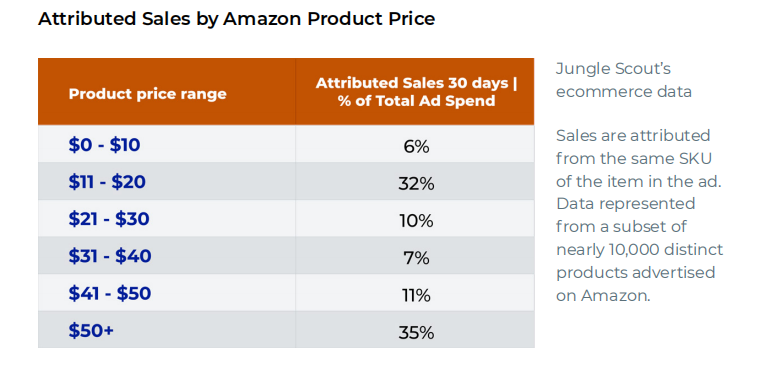 在亚马逊上做广告的品牌中,定价在11- 20美元和50美元及以上的产品有最高的14天和30天的销售额。