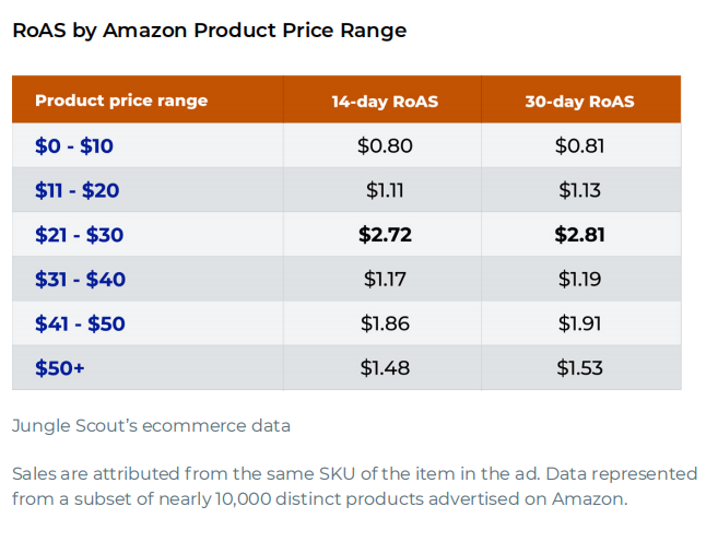 但高价产品是否意味着更高的回报呢?RoAS在10美元价格范围内有所增加,而在21- 30美元范围内的产品可获得最高的广告支出回报率,其所处的价格区间也是目前广告投放者在亚马逊上花费最少的。