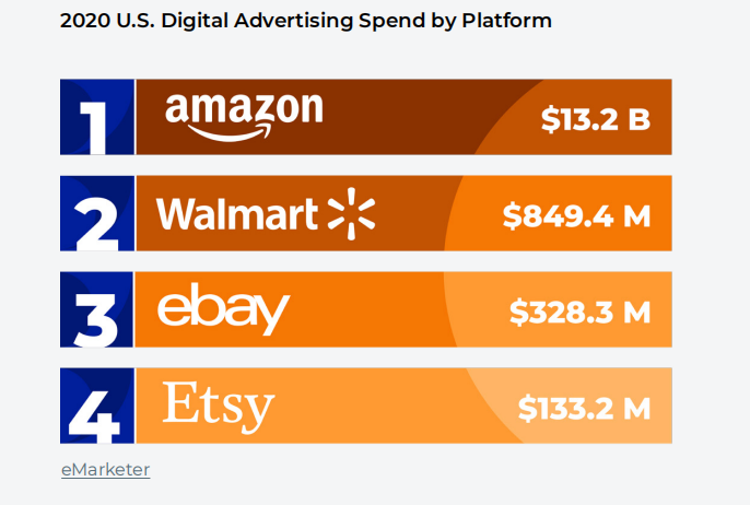 据报道,截至2021年3月,亚马逊全球活跃客户账户超过3亿,网站访问量达25.5亿次。美国数字广告支出市场研究指出,亚马逊的广告支出远远超过沃尔玛、eBay和Etsy等竞争对手。