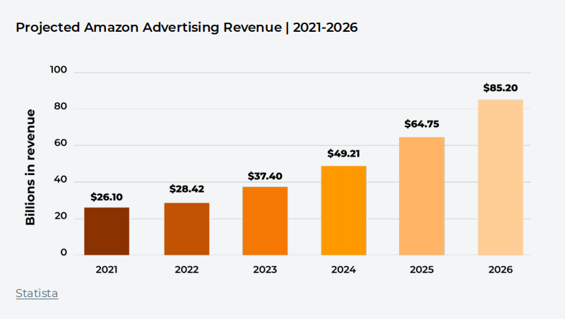 2021年,亚马逊的广告收入预计将超过260亿美元,到2026年预计将增至850亿美元以上。