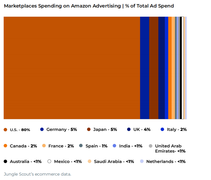 Jungle Scout电商数据库的14个市场中,美国在亚马逊广告支出方面排名第一,占约80%,其次分别是德国、日本、英国、意大利、加拿大、法国、西班牙、印度、阿拉伯联合酋长国、澳大利亚、墨西哥、沙特阿拉伯、荷兰。