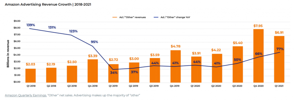 亚马逊的广告收入在2021年第一季度实现了巨量增长,预计将持续增长。