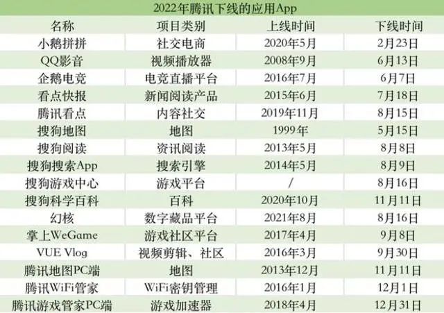 据媒体统计,2022年内,腾讯至少关停、下架App应用16款,包括幻核、QQ影音、看点快报、搜狗地图、腾讯WiFi管家等一众知名产品。