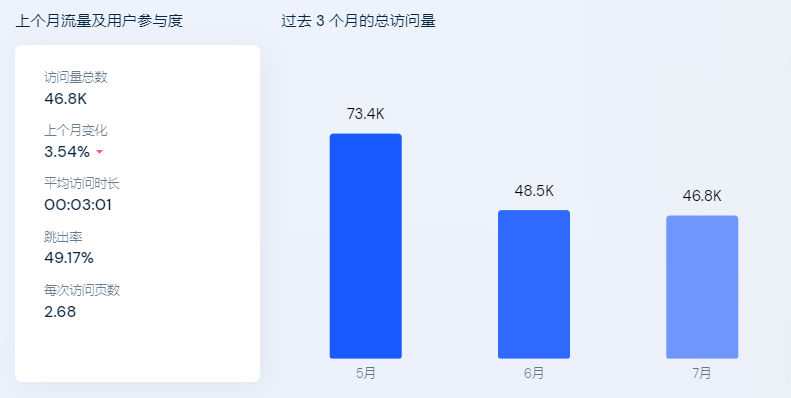借用 similarweb 对该独立站进行数据分析发现,最近三个月网站的访问量均保持在 4-5 万左右。在今年五月份,因其在 TikTok 上一条视频播放超百万,进而使该月访问量达到 7.3 万之多。