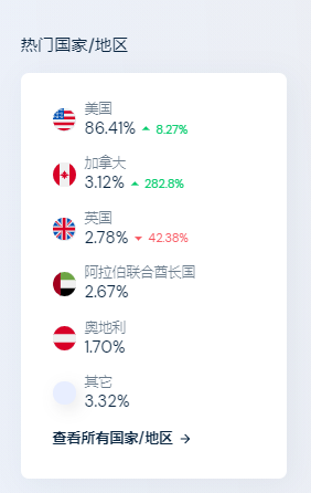 数据还显示,网站的访问来源主要以直接搜索和社交来源为主,其中访问量最多的国家来自美国,共占据了总访问量的 86.41%,而加拿大访问量则在近期突然大爆发,涨幅达到 282.8%。