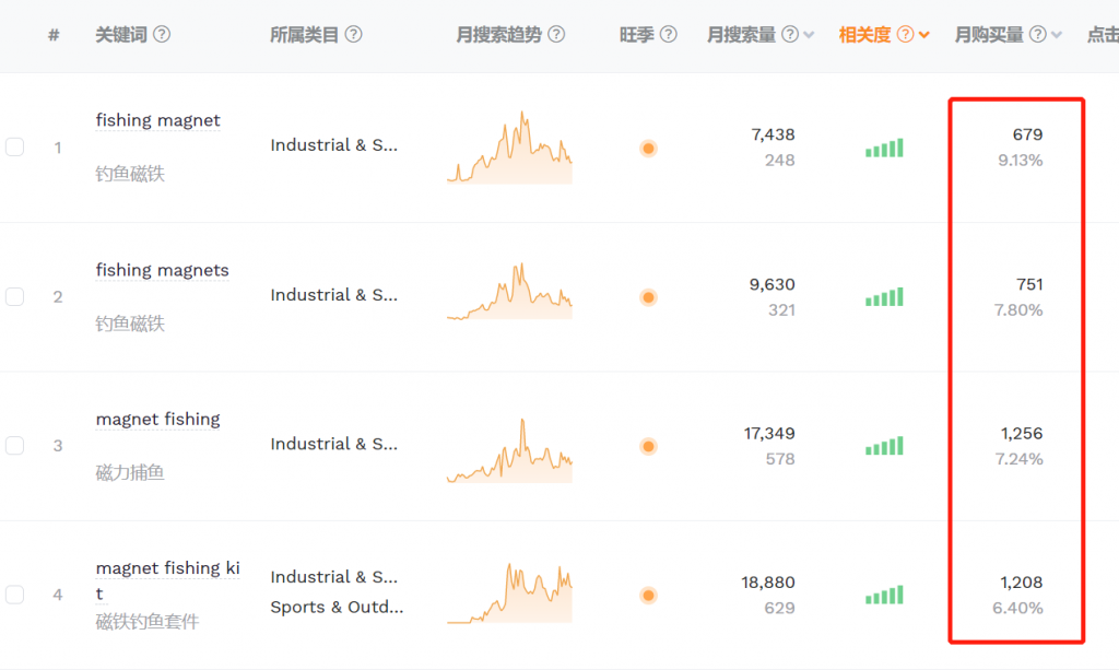此外,关联关键词“钓鱼磁铁”的热度在亚马逊的搜索热度也相当高。