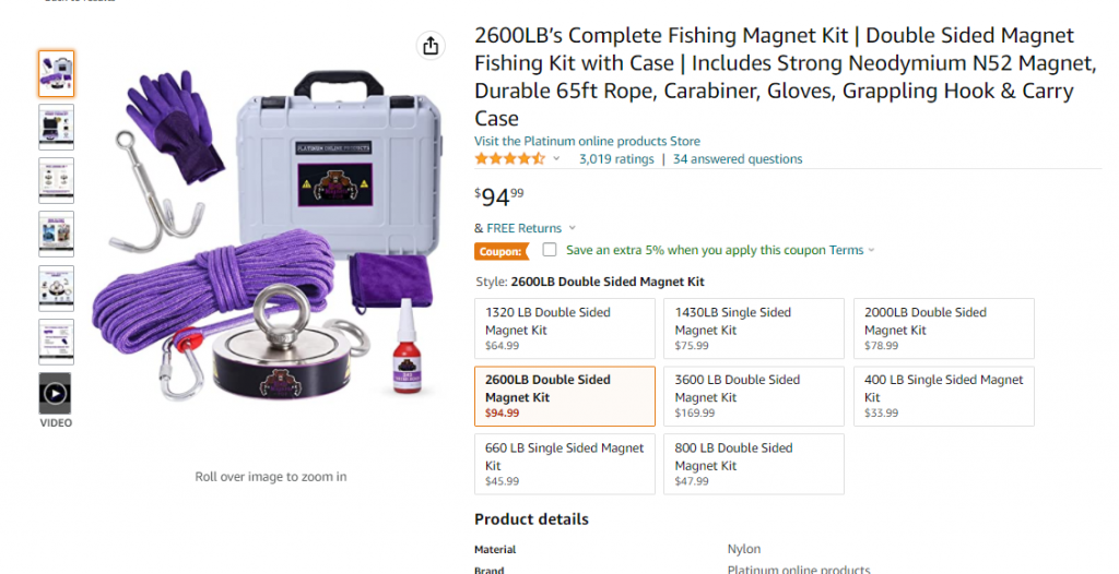 翻到前台,销量最高的一款爆款磁力钓鱼套件售价约为 95 美元,至今共获得了 3019 个评价,且基本以 5 星好评居多,占 70% 左右。
