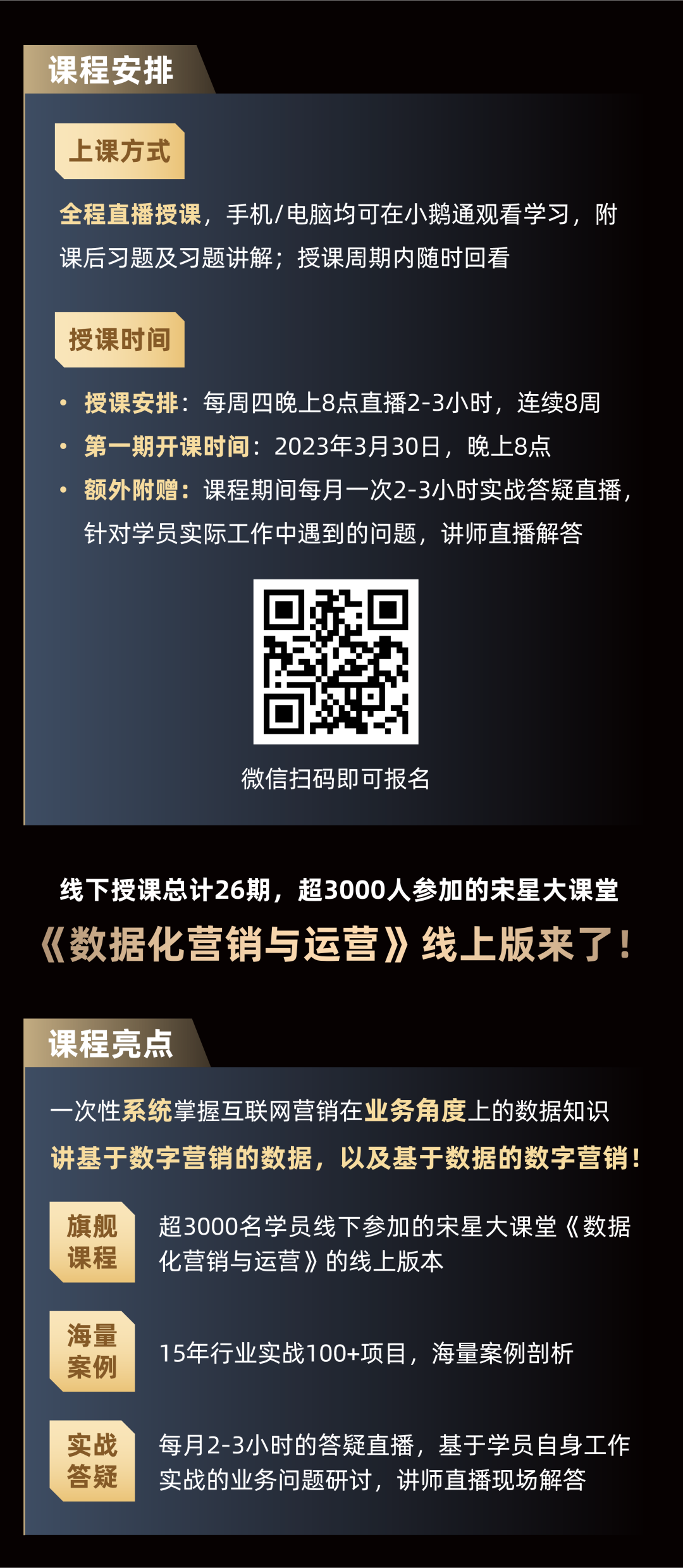 我在线下讲了26期的“宋星大课堂——《数据驱动的数字营销与营销》”,一直受到了很广泛的关注,现场参加过这门课的朋友已经超过3000人次。