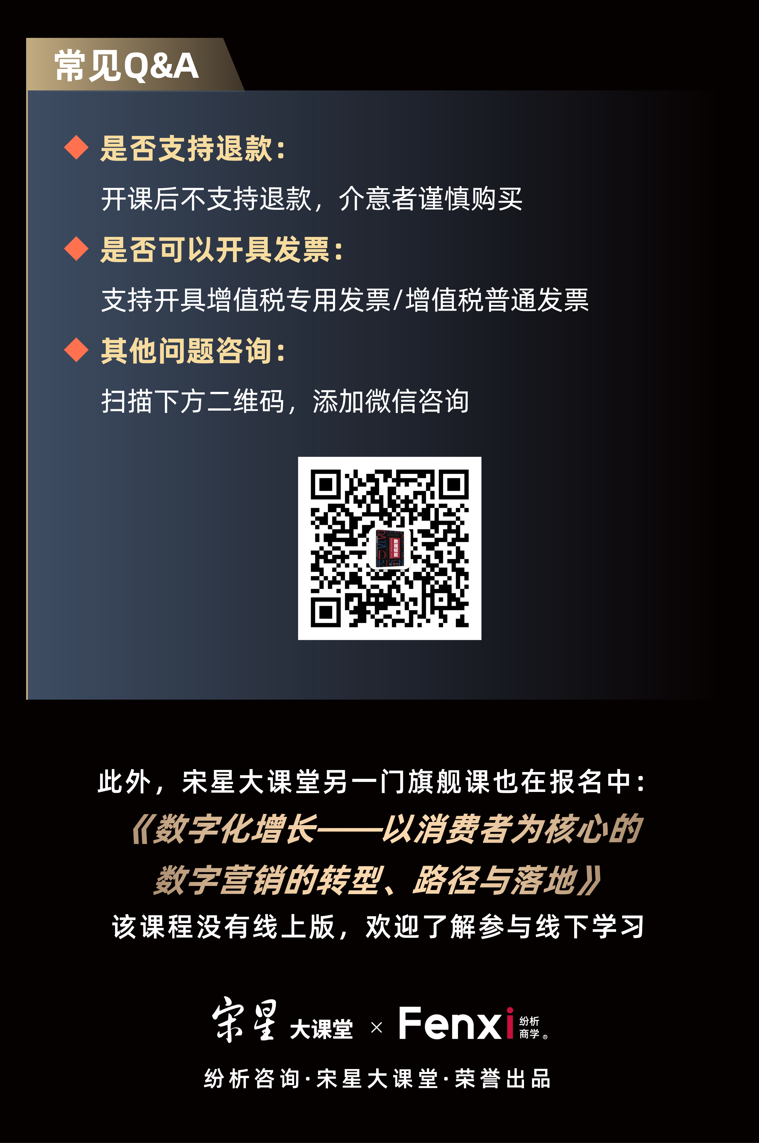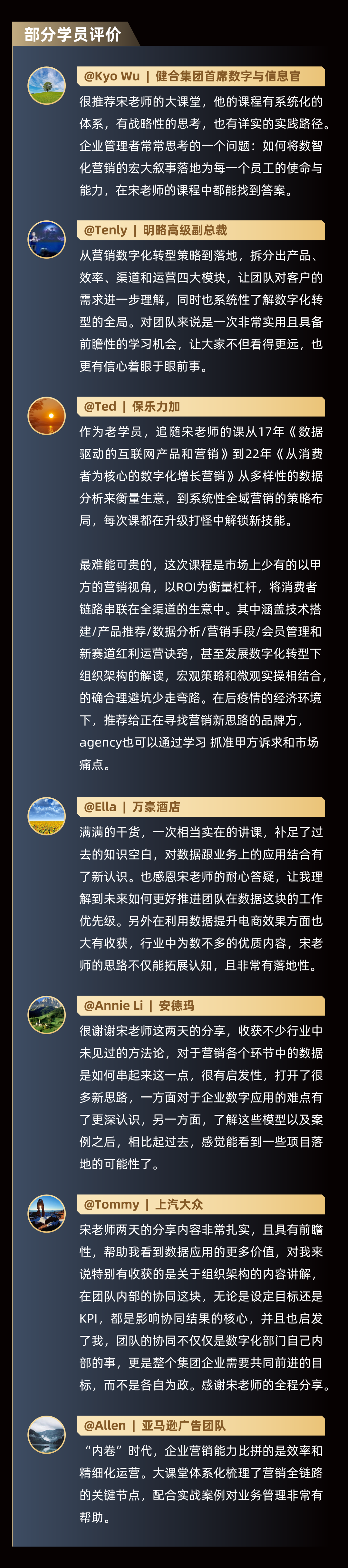 所以,这门课,因为它特别的体系化,特别具有完整的系统性与方法论,以及我在过去十多年中所积累的很多优质的案例,即使在讲过了26场之后,即使是我在开设了新的线下大课堂(《数据驱动的数字化增长——以消费者为核心的数字营销转型、路径与落地》)之后,也不可能停住脚步。它的使命,帮助从业者打下的基本功,以及帮助从业者形成系统化认知与思维,实在是太重要了!