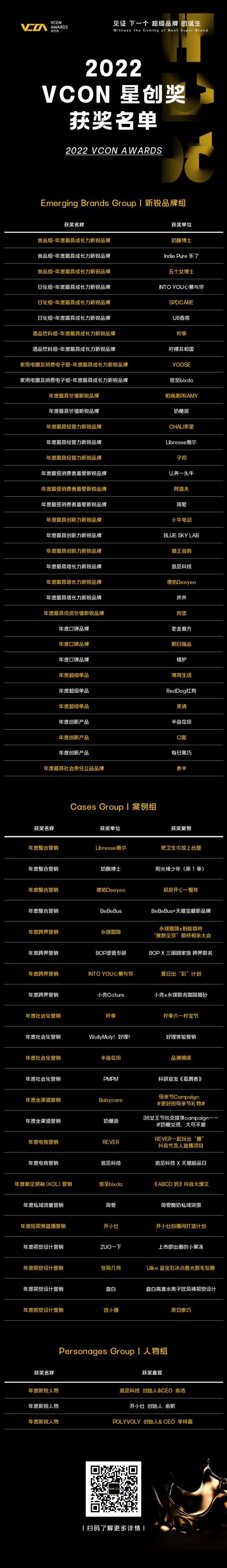 这些品牌和案例释放出的趋势洞察与商业智慧,为新锐品牌的成长探索提供了有效的启发与借鉴意义,助力下一个超级品牌诞生。以下为现场具体发布的获奖名单: