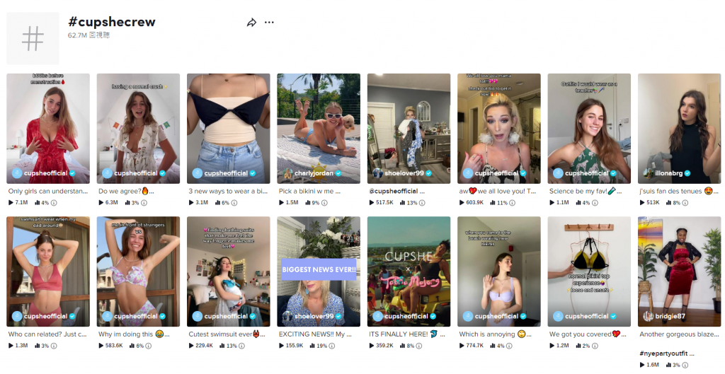 此外,CUPSHE还会通过各种标签挑战赛打造时尚事件。比如CUPSHE曾在TikTok上发起过话题为#CUPSHEcrew的主题品牌标签挑战赛,通过KOL带头吸引一般用户跟随发帖,成功在TikTok上狠狠收获了一波流量,大大提高了品牌曝光度。