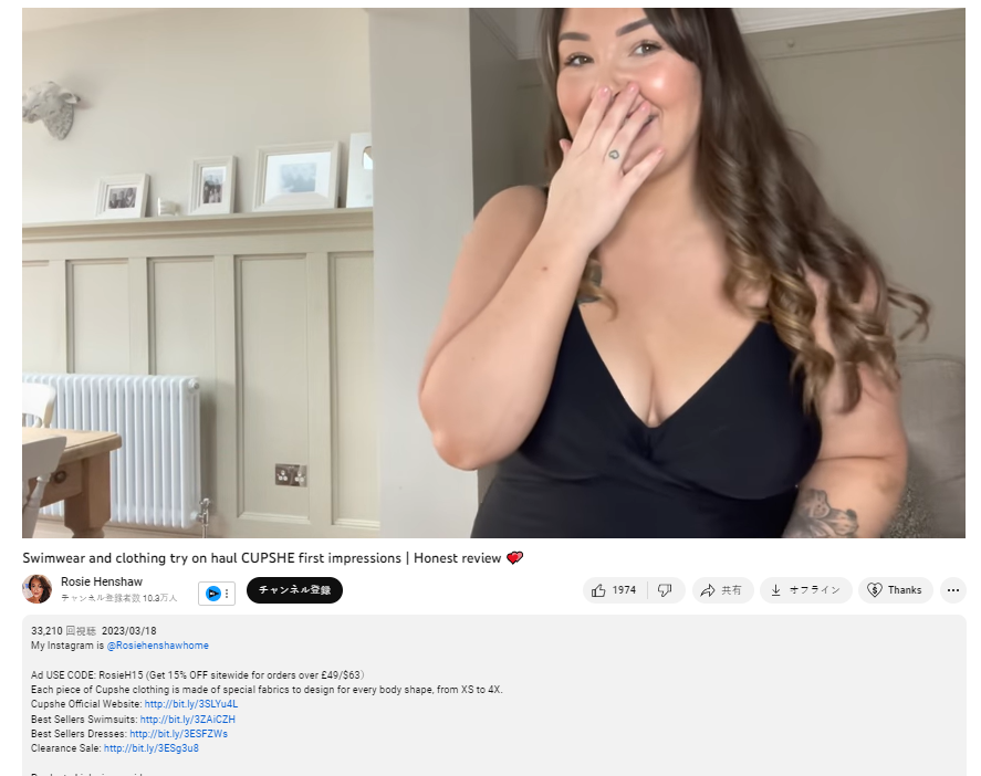 且根据平台不同,CUPSHE网红营销发布内容也有所区别。比如以长视频为主的YouTube上的内容多为开箱测评类,通过生活时尚类博主真实的购物体验或试穿测评,粉丝种草后可以直接点击视频下方的购买链接进行购买。