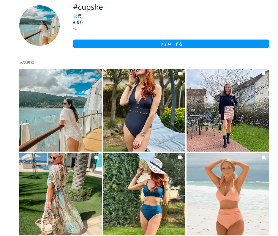 而在以图片内容见长的Instagram上,其KOL发布内容就变成了晒穿搭、美照,以时尚博主独特的搭配突出商品的独特设计,吸引粉丝关注购买。这些内容往往标注标签#cupshe,在增加品牌曝光度的同时,又能触达更多用户。