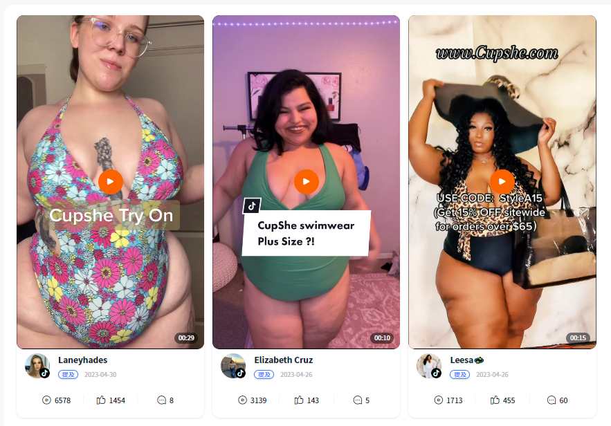 并且自2020年起,CUPSHE也开始布局TikTok,且网红合作多以大码网红博主为主,其试穿视频播放量更是高达百万,不仅吸引了更多大码消费者的关注,同时也再次强调了“包容、自信、女性友好”的品牌价值观。