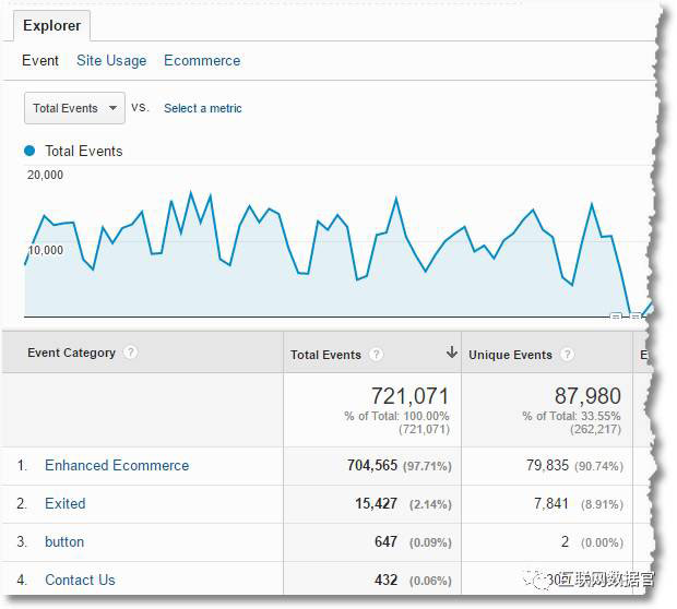 在事件追踪报告的顶部有三个选项:事件、网站使用情况和电子商务。