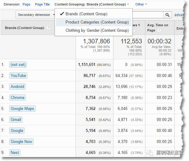 福利:大多数人会停在默认视图报告的位置,GA团队在整个标准报告中增加了一些出色的构思。例如,趁我们正在探讨,尝试一下内容分组的主要维度。接下来看一下内容分组的品牌报告。