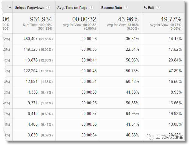 暂停一下,注意这个报告建设的有点缺陷。它展示了页面浏览量(很好),唯一身份浏览量(很棒)以及另外三个并不好用的指标:平均页面停留时间、跳出率、退出百分比(个人认为退出百分比是GA中最糟糕的一个指标)。