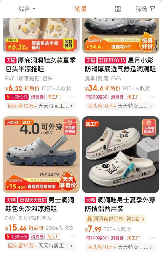 “咱就是说,淘工厂太懂我了,价格便宜,从六七块钱到三四十的都有,样式还很多,穿着舒适度上也并没觉得和crocs有太大落差,以前一双的价格,现在最少能买10双不同颜色的洞洞鞋,太香了。”凯莉笑道。