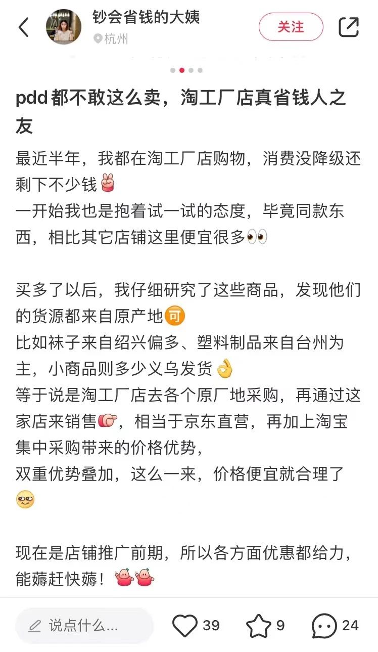 而随着越来越多的高性价比好物被消费者挖掘出来,并自发的在小红书等社交渠道上进行分享,淘工厂这个低调耕耘的业务,在“性价比”浪潮下,逐渐被推向台前。
