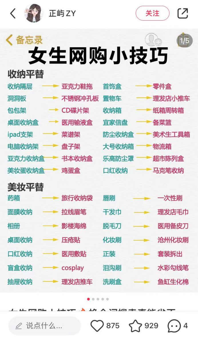 以“换个方式搜有惊喜”这一类,利用搜索关键词上的技巧,找平替省钱的策略为例,在一篇名为“女生网购小技巧 换个词搜索真能省不少”的笔记中,“美妆蛋收纳盒”被平替成了“鸡蛋盒”,“口红收纳”被平替成了“马克笔收纳”,包包被平替成了“白沟包包”… … 而平替词汇里,像“脱毛刀”与“医用备皮刀”的等量代换的脑洞大开,让一众渴望“精致省”的年轻人大呼“累觉不爱”。