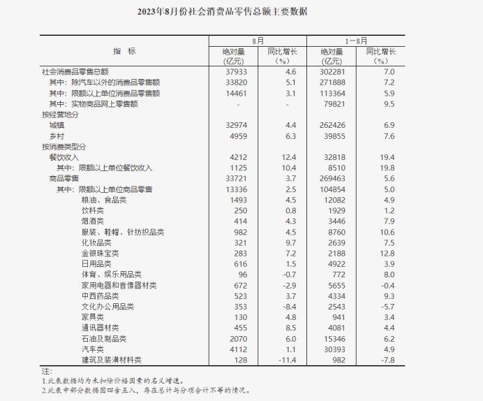 据国家统计局2023年9月15日发布的数据显示,8月份,社会消费品零售总额37933亿元,同比增长4.6%。其中,除汽车以外的消费品零售额33820亿元,增长5.1%。