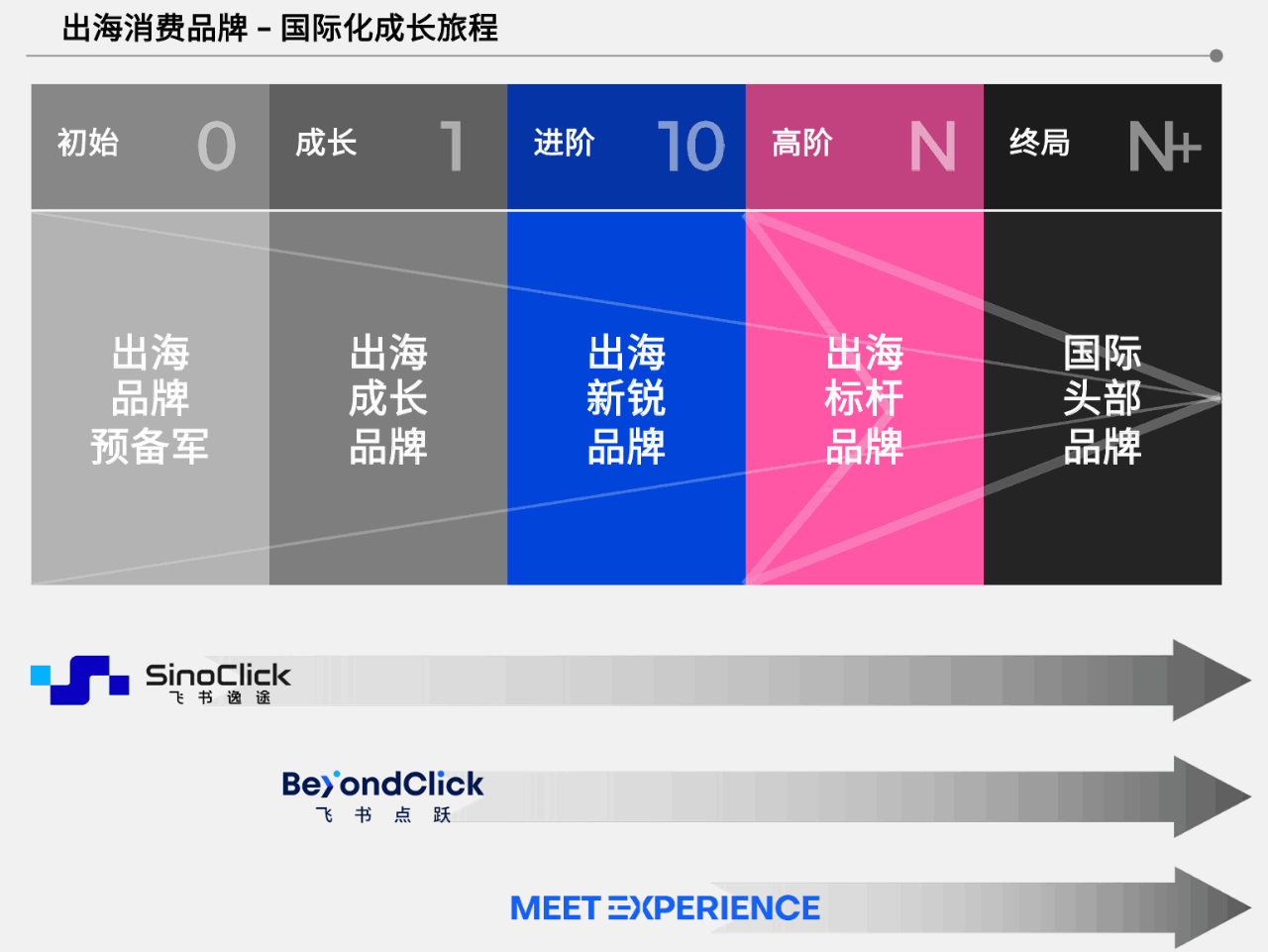 在这十年之间,飞书深诺不断扩张服务能力范围,协助不同阶段的出海品牌实现从 0 到 1、从 1 到 100 的跨越。如今,飞书深诺已分化出负责不同服务的子品牌,形成了一套包含跨境电商品牌 SaaS 服务平台 SinoClick、出海数字营销服务品牌 BeyondClick、出海营销全域数字技术服务品牌 Meet Experience 为一体的服务链路。这就像一块不断扩张的能力版图,根据市场的需求持续叠加、升级,才有了今天的面貌。