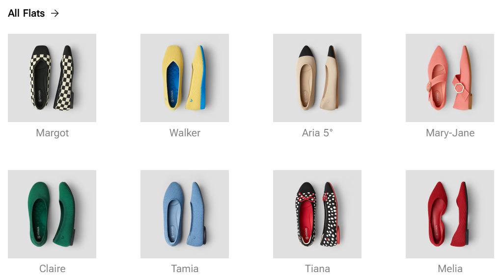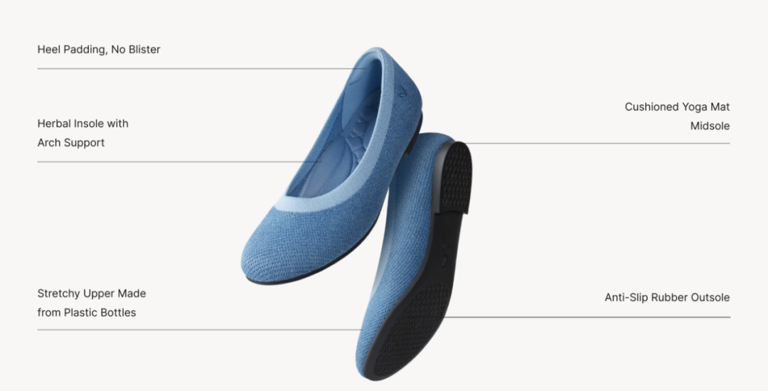 往近了说,Vivaia的同赛道里,就还有Rothy’s这么一位前辈,核心单品也是平底鞋,核心受众也是职场女性,核心卖点也是回收塑料瓶制成可机洗的鞋,挡住logo和Vivaia摆一块儿,看不出多少差别。