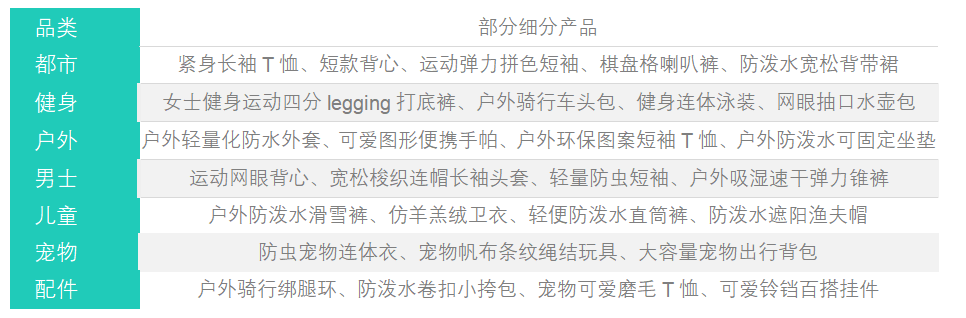 根据天猫平台可以看出,其产品主要集中在轻户外方面,包括都市、健身、户外等场景;安高若的产品矩阵包括都市、健身、户外、男士、儿童、宠物和配件等,其产品矩阵如下: