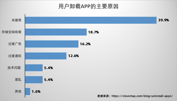 更何况,今天的用户越来越痛恨被打扰。有一个调研显示,在回答为什么卸载App这个问题时,有超过28%(16.2%+12.6%)的用户是因为觉得App打扰到了他们,比例仅次于第一个原因:他们用不上这个App(40%)。