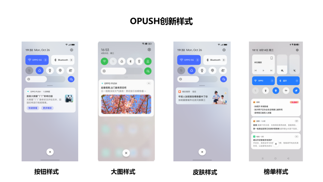在形式方面,我还是觉得OPUSH是绝佳的例子,它比我们想象中的PUSH走得远得多。它能够推送的消息,不仅仅是文字,还可以是图片甚至动态视频内容。此外,它还可以被装扮起来呈现出不同的皮肤,或是以高亮的方式展现,或者,能够保持置顶。