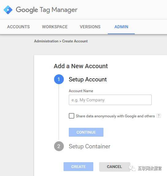 我们先在帐户中创建第一个容器,每个容器都有一个唯一的GTM代码。由于每个帐户可以创建多个容器,如果你有一个测试网站,那么就可以创建一个单独的容器,方便在上线前测试网站代码。