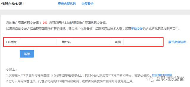 百度统计和CNZZ都有传统的手工安装代码方式,不同的是百度统计更加人性化,增加了“一键安装”功能,只需要输入FTP信息即可,照顾到了0代码基础的运营人员。