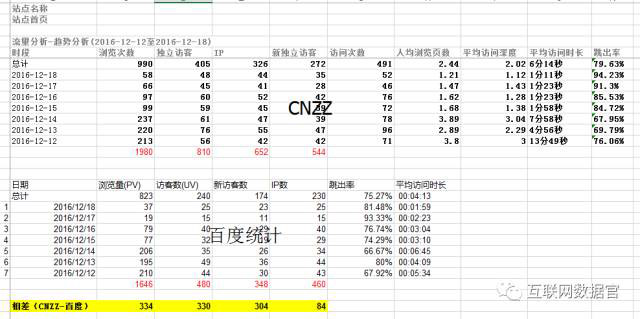 分别下载CNZZ和百度统计的一周“趋势分析”报表,EXCEL数据对比得出CNZZ统计得出的数据普遍比百度统计多,主要是由于不同软件的统计原理不同,甚至是服务器稳定性造成的。