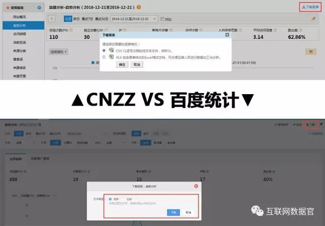 CNZZ和百度统计都有导出数据功能,但CNZZ只有CSV和XLS两种格式,百度统计有PDF和CSV两种格式,就易读性来说,百度统计的PDF给了简版图文报告+源数据报告,CNZZ则只有源数据报告,而且CNZZ还有个坑,分析CNZZ源数据时,不能下载CSV,表中有隐藏符号(”),只计数,不统计;就生成速度来说CNZZ秒开,二百度统计则会显示等待30秒至5分钟。