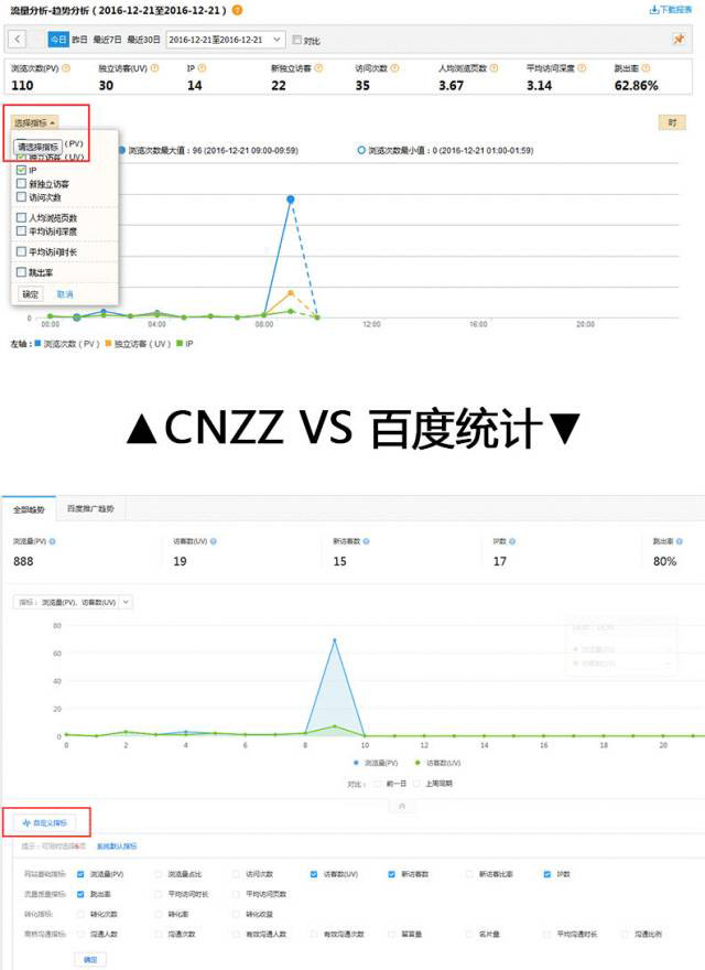 接下来我就百度统计和CNZZ两个统计平台,按照基础指标、个性化操作、特性对比、推荐功能四个方面,写一篇中小企业统计平台的横向对比评测,以方便大家选择使用。