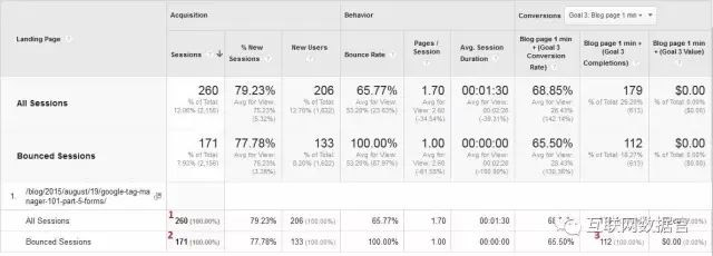 想要确定有多少次发生跳出的会话同时触发了1分钟的计时器,可以在Google Analytics中添加如下图所示的细分——跳出会话。在图中红色字标出的数据就是参照图中如上计算方式得出的结果。