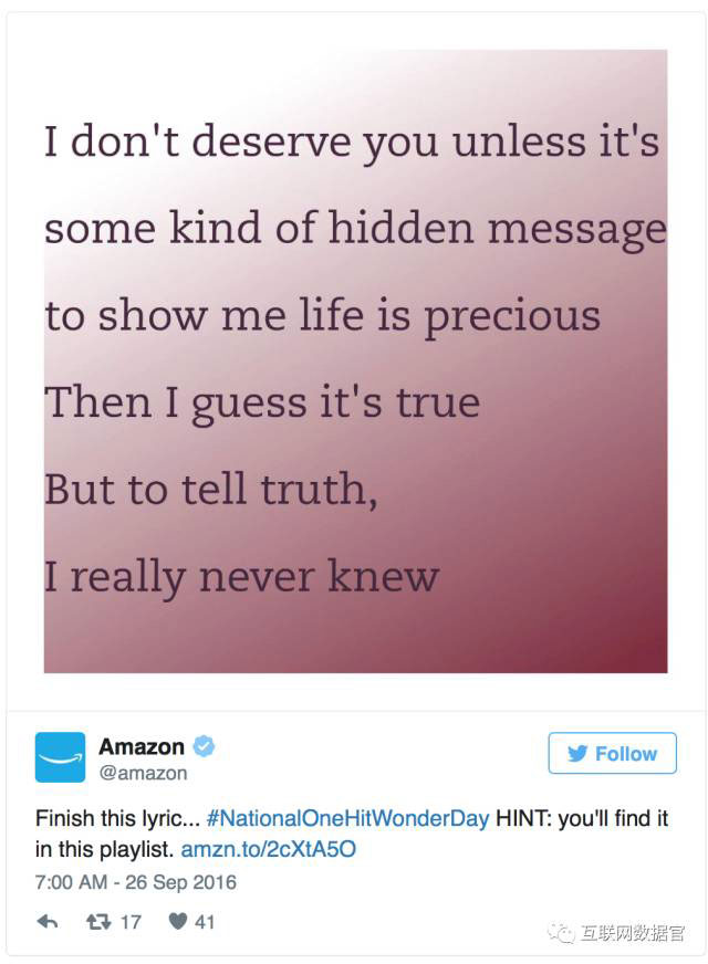 亚马逊确实注重并利用了Twitter的社交性。为了确保粉丝能够感受到自己也属于对话的一部分,他们在发推文时均采用聊天的语气以及非正式内容的陈述风格,高超到连粉丝都不会觉得自己是在被打广告: