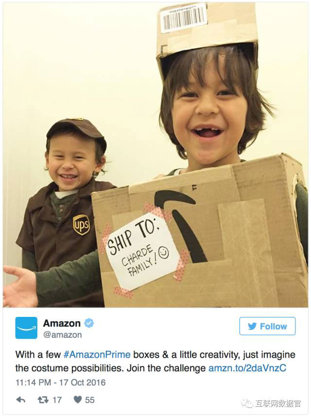 TWEET译文:只需几个#AmazonPrime盒子和一点点创意,就能想象出制作各种服装的可能性。加入挑战 amzn.to/2daVnzC