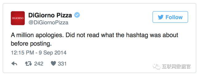 在发推之前,需事先了解引用的话题和衡量是否该使用这个话题标签来获取顾客。滑稽的“造节”通常情况下是安全的。Force Friday 和Taco Tuesday呢? 也安全。但DiGiorno 使用了 #WhyIStayed,而这个标签是有关国内暴力的,那就有危险了。仔细选择正确的话题会使你获取一些顾客,收获一些转发以及达到娱乐粉丝的目的。
