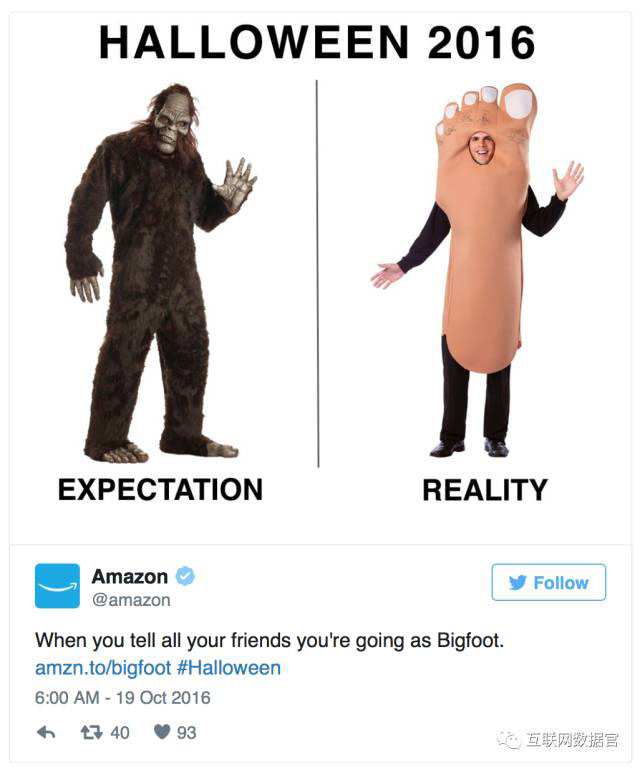 TWEET译文:当你告诉你的朋友,你将装扮成大脚怪。(左边是想象中的样子,右边是现实中的样子)