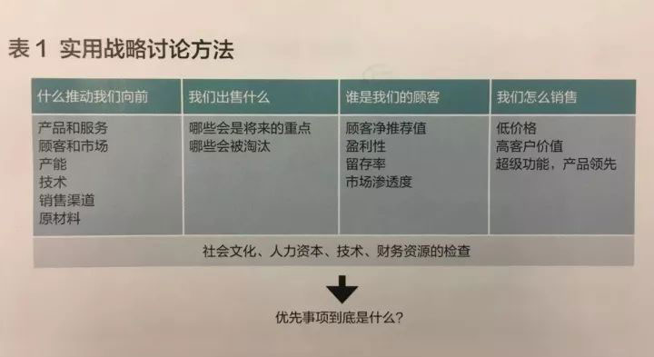 保罗•R.尼文提出了一个实用的战略讨论方法(如表1)。他把艰涩的企业战略问题化解为四组容易理解的问句,通过对这些问题的回答和辩论,可以帮助我们识别出优先的战略步骤,并通过OKR来落实执行。