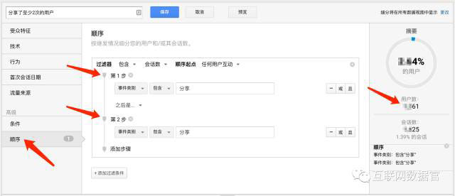 “分享的UV”换一个说法就是“分享了至少1次的用户数”,那么“分享了至少2次”、“分享了至少3次”这些用户数又是多少呢?这时候我们需要用到GA的高级细分中的“顺序”功能: