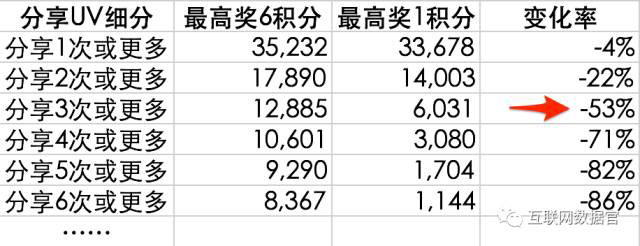 可以看到在前后两种奖励规则之下,分享次数越多的用户,其数量的降幅也越大。而且分享至少2次和3次的人数降幅,从22%突然提升到53%,我们可以解读为,从分享3次的用户开始,有明显的“为了积分而分享”的行为。而那些分享2次的用户,即使得不到更多的积分,也并没有明显减少分享行为。所以我给运营同事的建议是,如果希望奖励机制对那些“发自内心分享”的用户最有利,那么就可以把每日奖励上限提升到2积分试试看。
