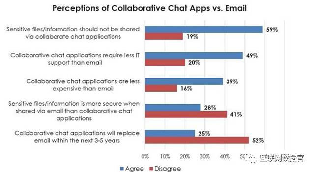 虽然离替代电子邮件还有很长的路要走,但聊天应用程序可以与电子邮件协同作用。他们彼此之间没有冲突,Tsai说到,“虽然IT专业人士相信这些协同工具是有用的,但大多数人并不认为它可以在未来3 – 5年内替代电子邮件。大多数公司使用商务聊天应用程序来补充电子邮件,而不是替代它。”