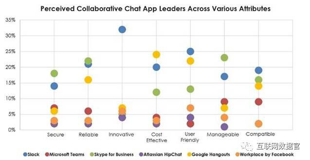 在创新方面,Slack排在首位,并且在用户体验和稳定性方面和其他应用程序一起排在首位。Google Hangouts在性价比方面排第一位,并且在用户体验方面紧跟Slack之后居第二位。